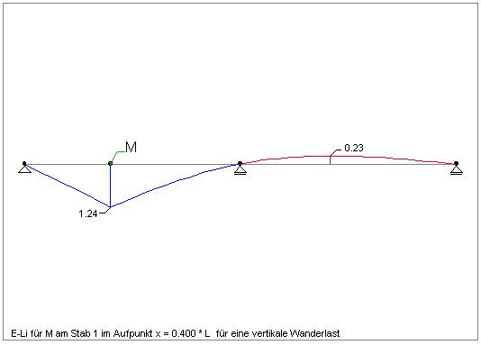 ProStab kann für ebene Stabtragwerke Einflusslinien für alle statischen Größen aufstellen. An der Cursor-Position (Lastpfeil, hier nicht zu sehen) wird der EL-Wert angezeigt.